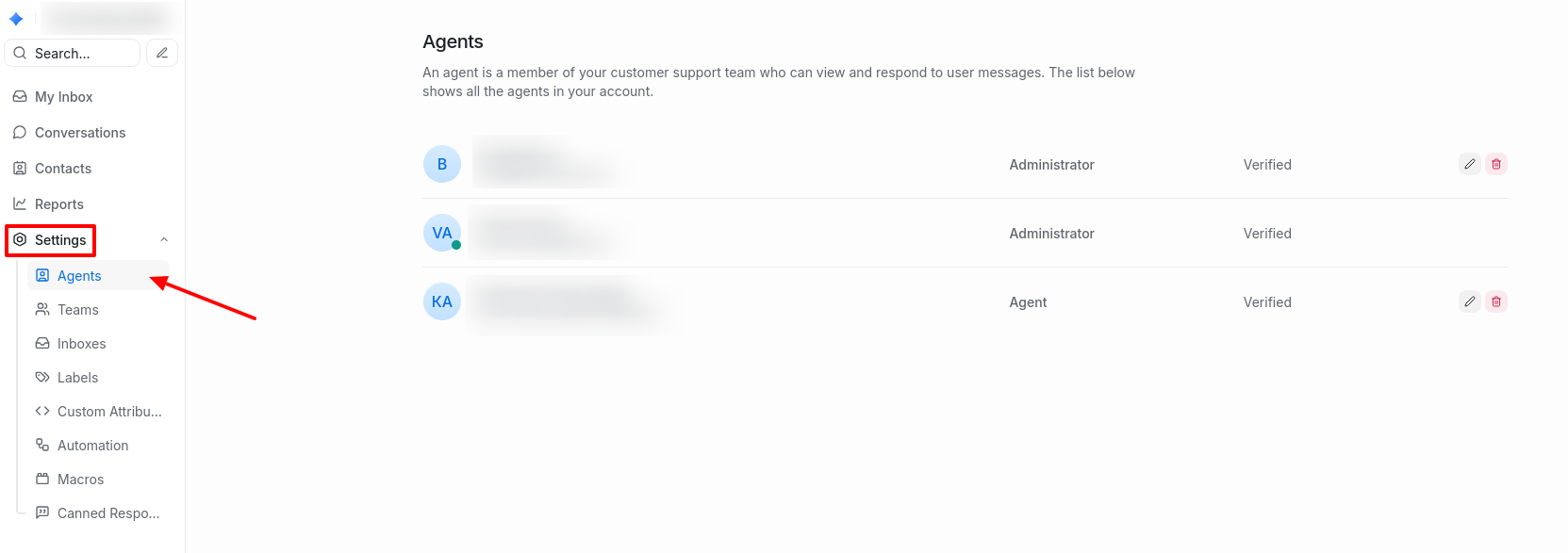 To see the list of your agents, go to Settings → Agents. This section displays your employees who have access to the BrandWizard personal account. To add a new employee, navigate to the Users section of your personal account. More details about the connection process can be found here.