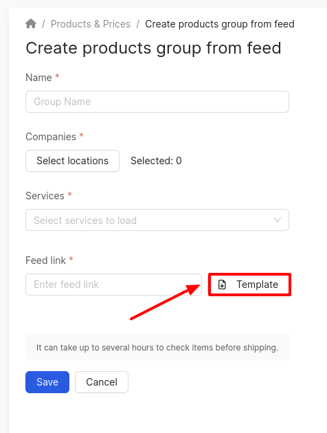 You can download a feed template on the Create products group from feed page in your account.