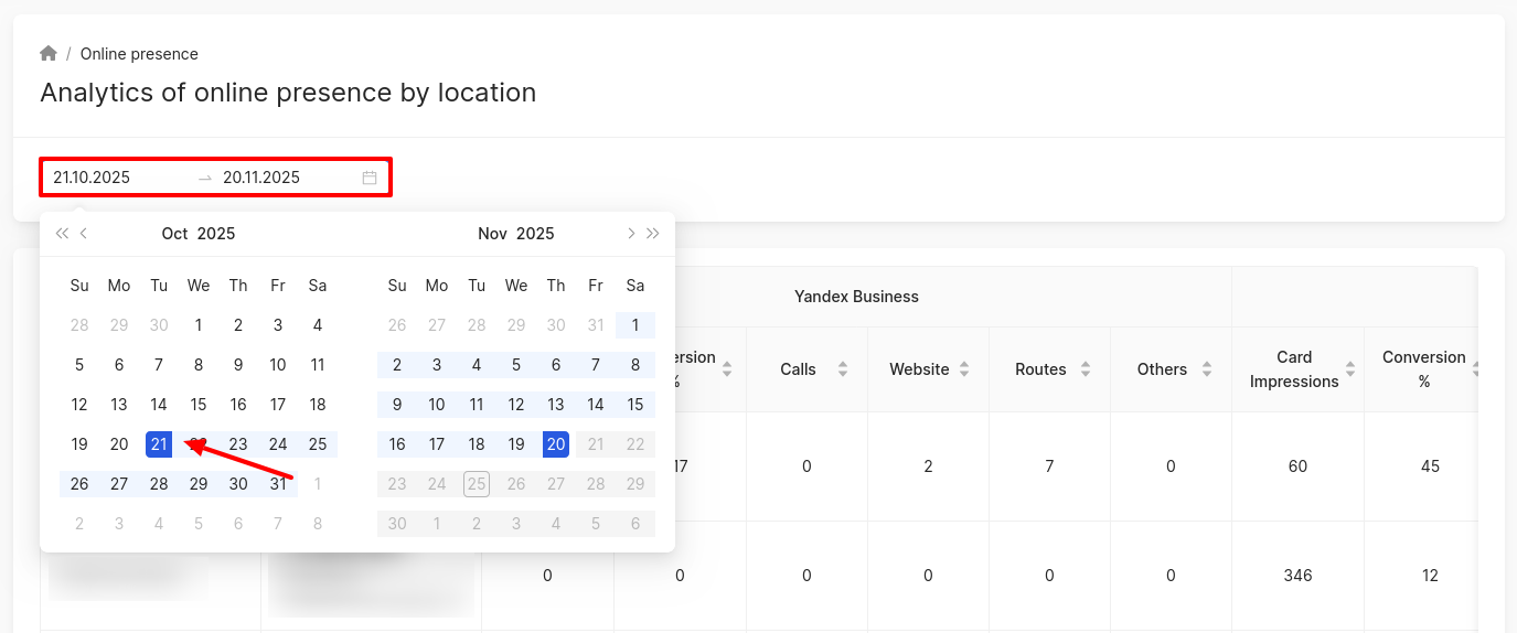 You can choose the period for which you want to view location statistics. To do this, click on the field and select the dates.