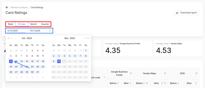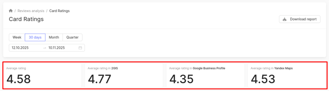 On this page, you can see the average company ratings calculated across 2GIS, Google, and Yandex catalogs as a whole, as well as separately for each of them. The average rating is calculated as the arithmetic mean of the ratings of all the cards on the last day of the selected period.