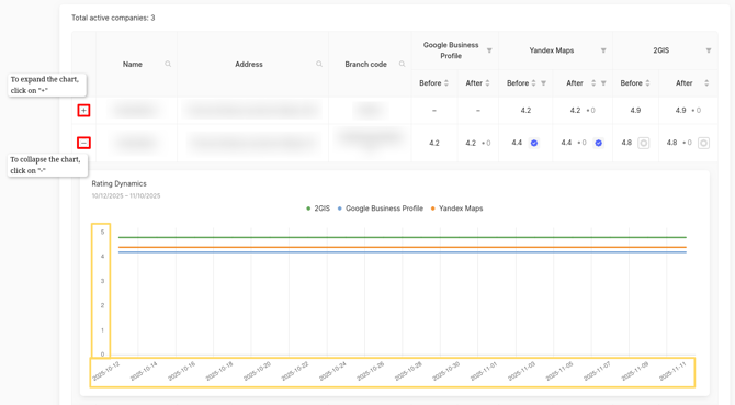 Yandex Rating: after, Google Rating: after, and 2GIS Rating: after fields will be color-coded to provide a clearer visualization of rating changes: