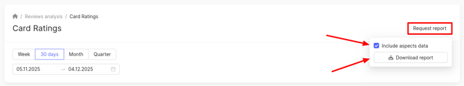 To export the card rating statistics, click on Request Report in the upper right corner of the section. If you want the report to include data on specific aspects, check the box. Then, click Download Report.