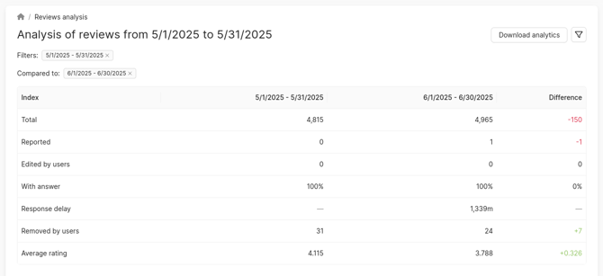 After setting up the Compare with Period filter, in the Reviews Analysis page header you will be able to view a table with indicators for two different periods.