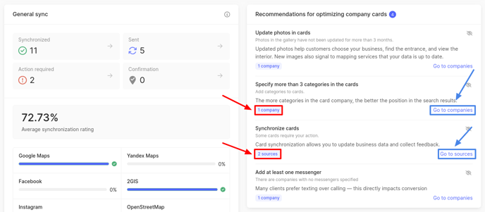 Depending on the recommendation, you can view the number of companies that need information updates, the number of new unanswered reviews and questions, as well as the catalogs to which companies are not linked. To implement the recommendations, you can immediately go to the relevant section with filtered information for the required data.