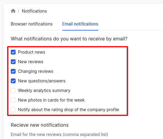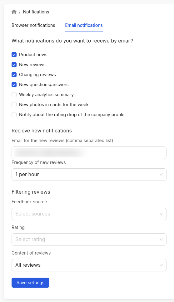 In this section, you can configure automatic email notifications about new reviews. This will allow you to receive timely updates, respond quickly, and analyze feedback effectively.