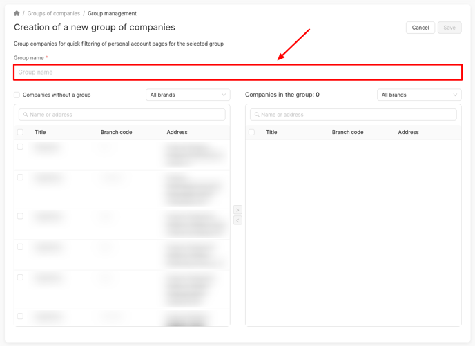 The page for Creation a new group of companies/Group management will open. First, enter or change the group's name.