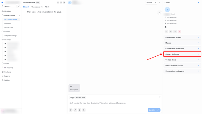 To add an attribute in the conversation sidebar, click on the Contact Attributes section.