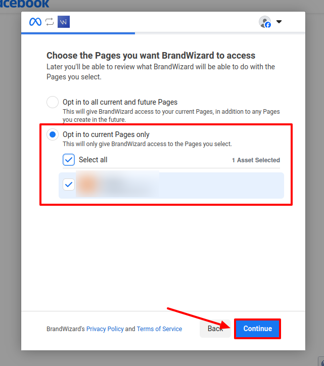 Next, select the pages that RocketData will have access to. Then click on Continue.