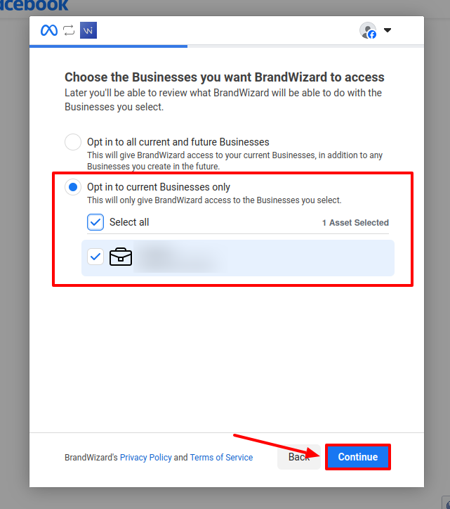 Next, select the companies to which BrandWizard will have access. Then click Continue.