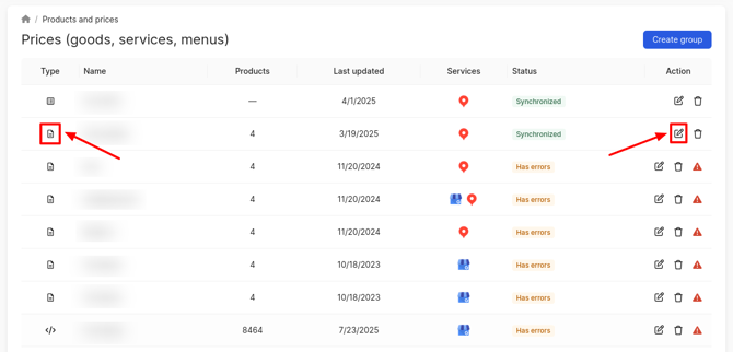 To modify a group from a file, click on the edit icon. You can identify the "from file" group by the Type column: an icon will be displayed as shown in the image below.