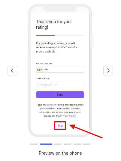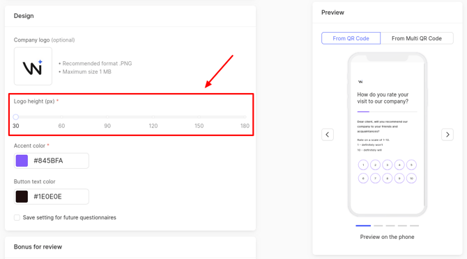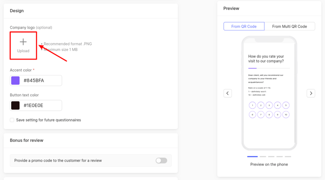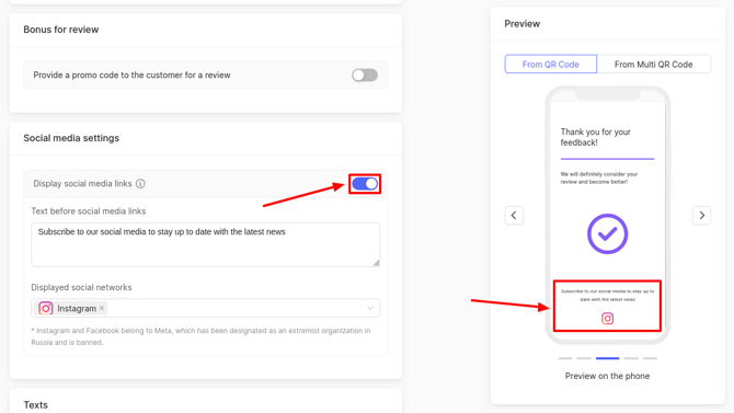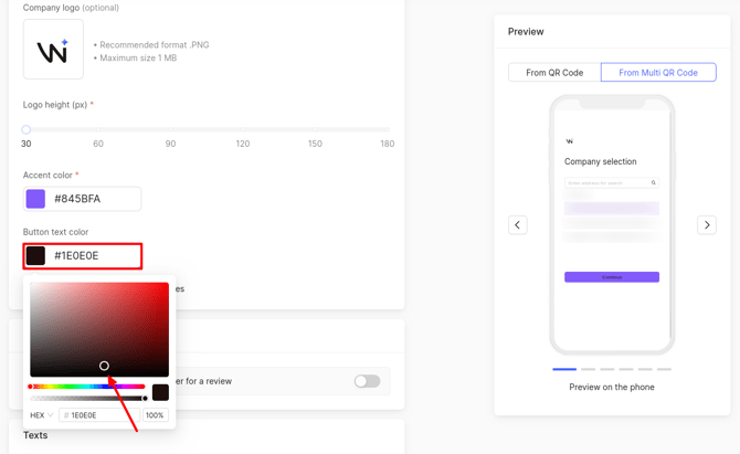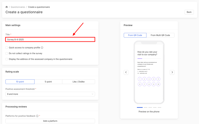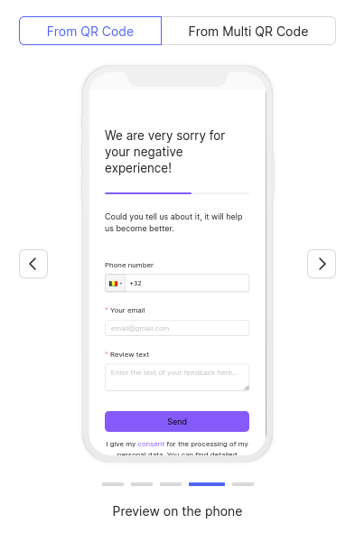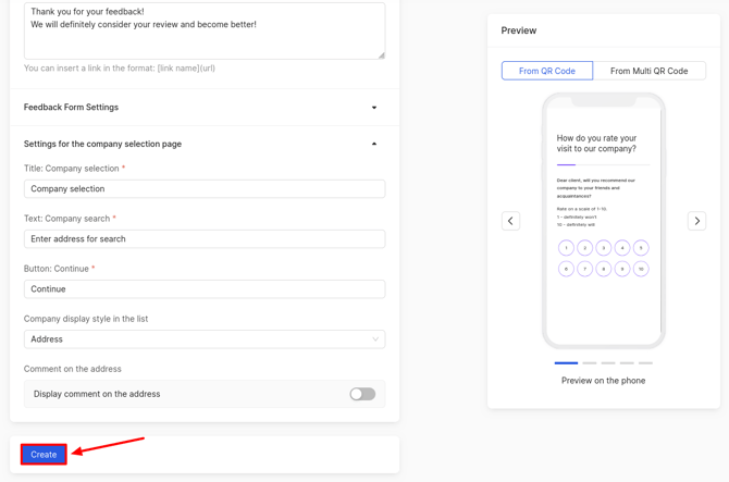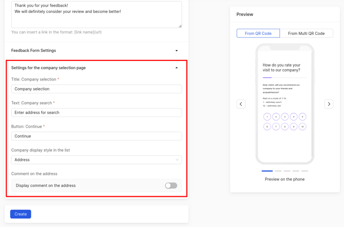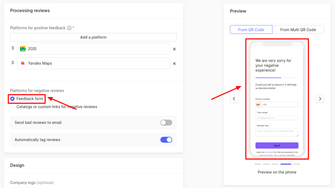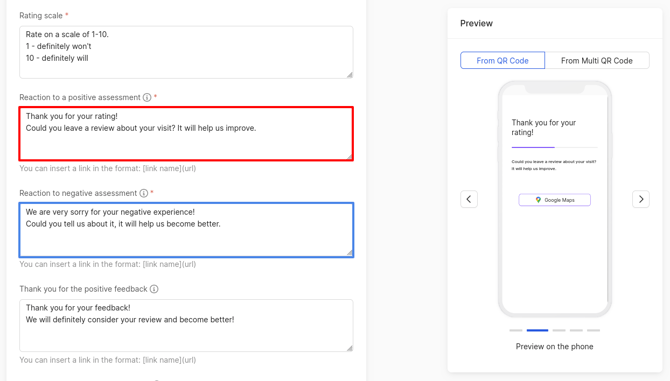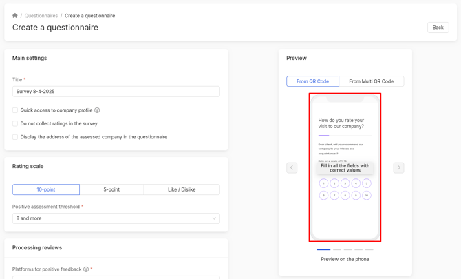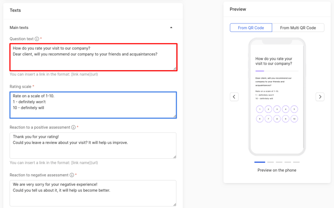The resulting changes can be tracked in the preview on the phone, which is located on the right side of the page. In this mode, it shows how the client will see the pages for leaving assessment and review when clicking on a QR code.