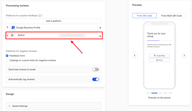 In the field for your link, specify the name of the button (that customers will click on) and the link to any of your pages or website, so that your customers can leave reviews there. You can also add a logo, which should not exceed 1 MB in size.