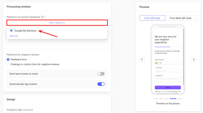 To select the directories where customers will leave their reviews, hover the mouse over Add a Platform, select the source, or Add Link (for your service).