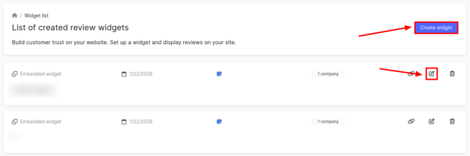 To add a widget, click the Create Widget button. To edit, click the edit icon in the widget list.