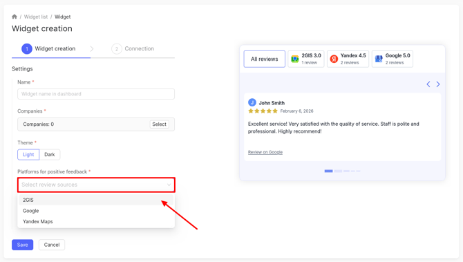 Select the platforms from which reviews will be displayed in the widget. You can select all available catalogs for which reviews are being collected.