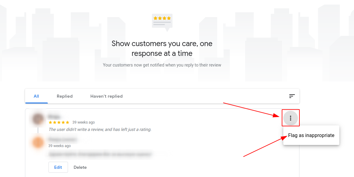 On the Reviews page, you should find the desired review and click on the three dots in the upper right corner of the review, and then click on Flag as inappropriate.