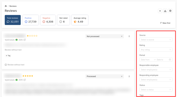 Please note! When using the filters Content of reviews → With text and Replies to reviews → Unanswered, deleted reviews with responses will also appear in the selection. This behavior is normal for the system. If you want to exclude such reviews from the display, use the filter Deleted reviews → Yes.