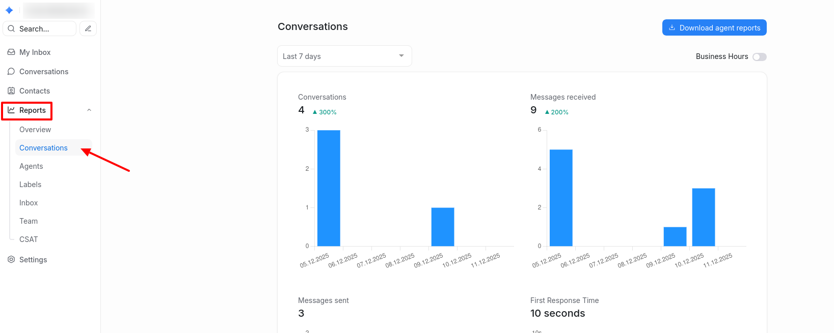 The Conversations Report provides an overview of all your conversations for a selected period of time. With this report, you can obtain important metrics about the state of your conversations, such as message volume, first response time, resolution time, number of resolved conversations, and more.