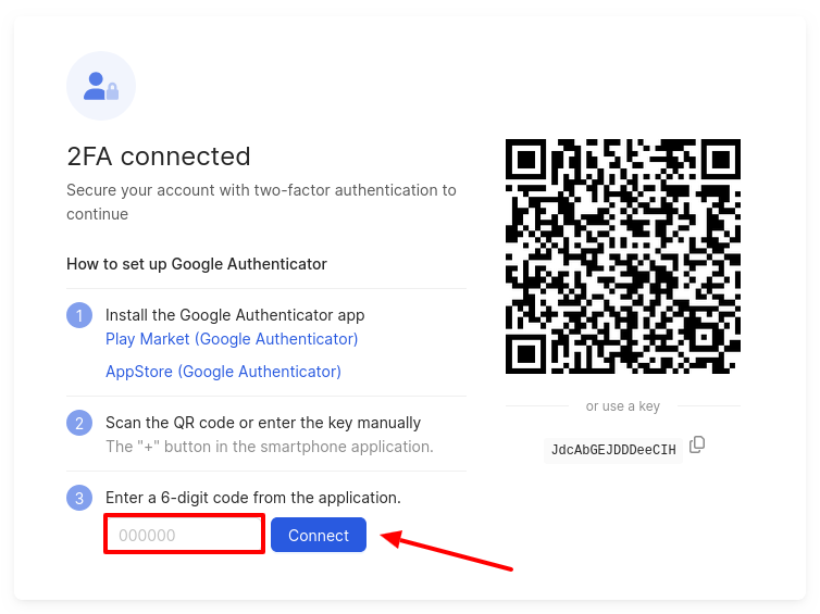 - Enter a 6-digit code from the application in the field and click on Connect.