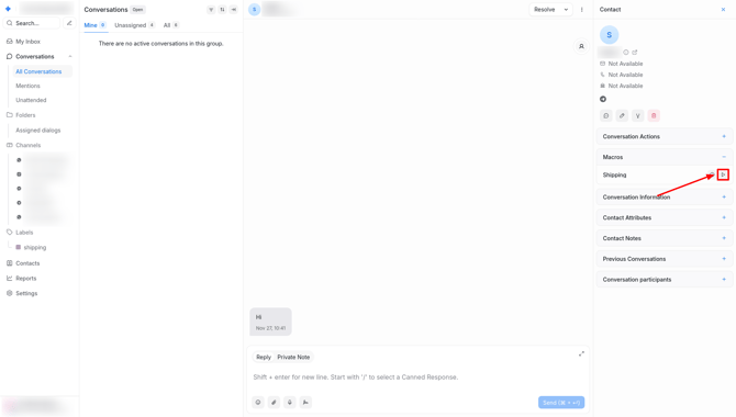 To run a macro in a conversation, click on the Macros section in the sidebar, select the desired macro, and click the play button.