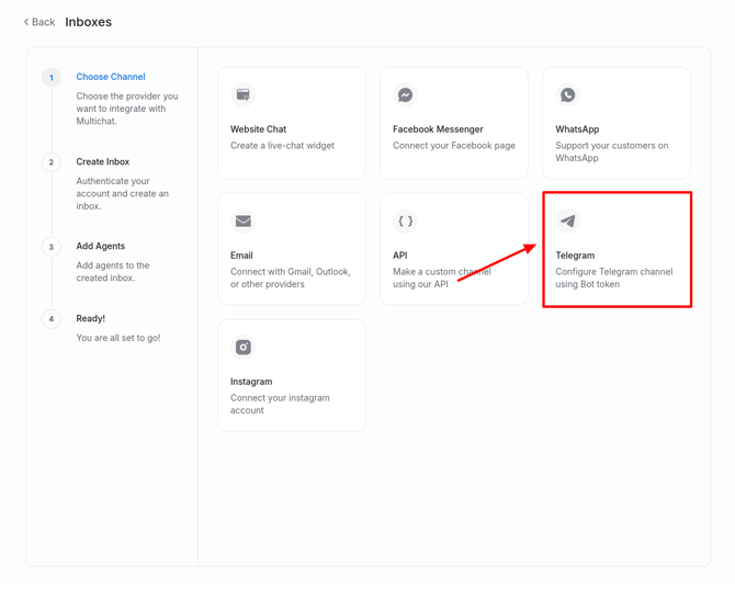 Go to Settings → Inboxes → Add Inbox.