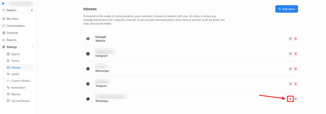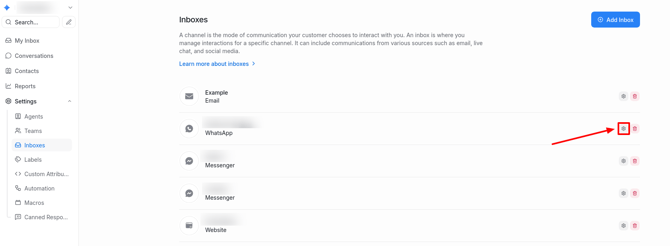 The created WhatsApp channel should appear in the Inboxes list. To view or change additional settings, go to Settings → Inboxes, then click on the gear icon on the WhatsApp channel.