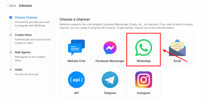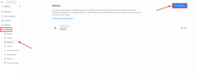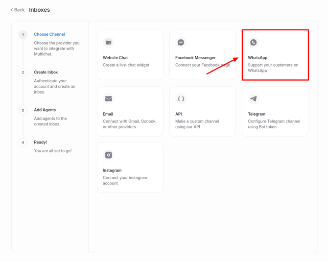 To create a WhatsApp channel, go to Settings → Inboxes → Add Inbox.