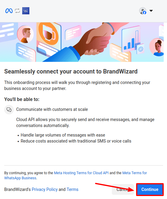 If you already have a Facebook business portfolio and a WhatsApp Business account, this step will be skipped, and you will see the next one immediately, as described below.