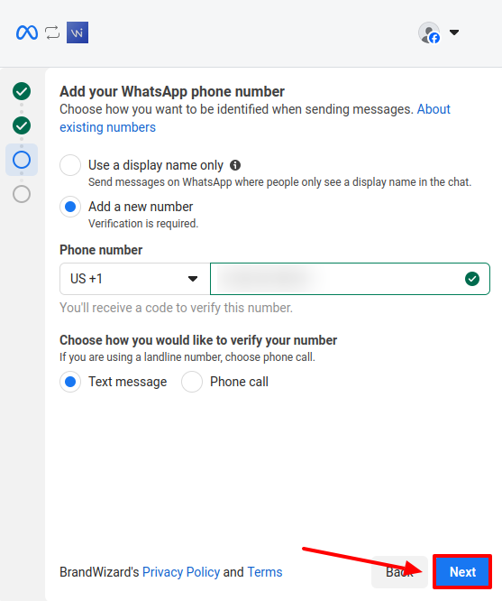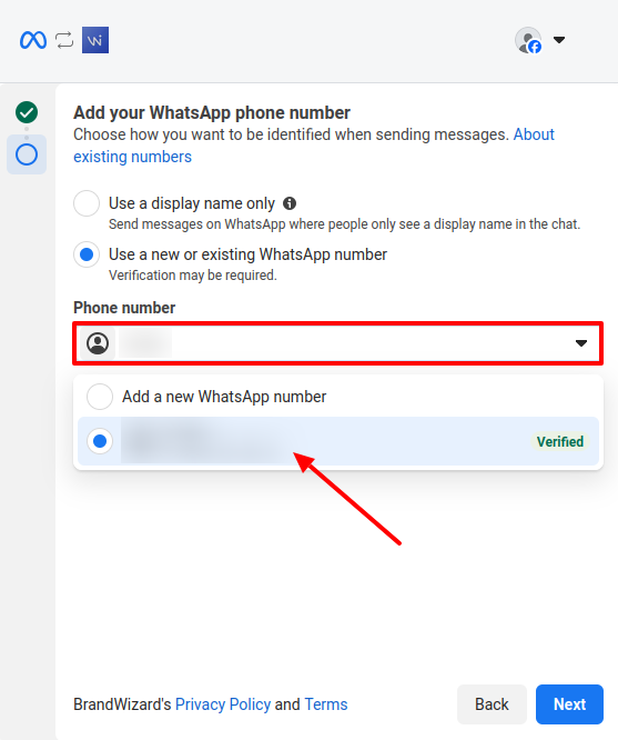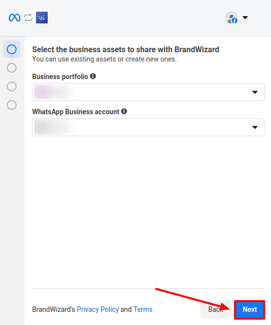 Select or create a Facebook business portfolio and a WhatsApp Business account (a dedicated account for company communications with clients on WhatsApp). Click Next.