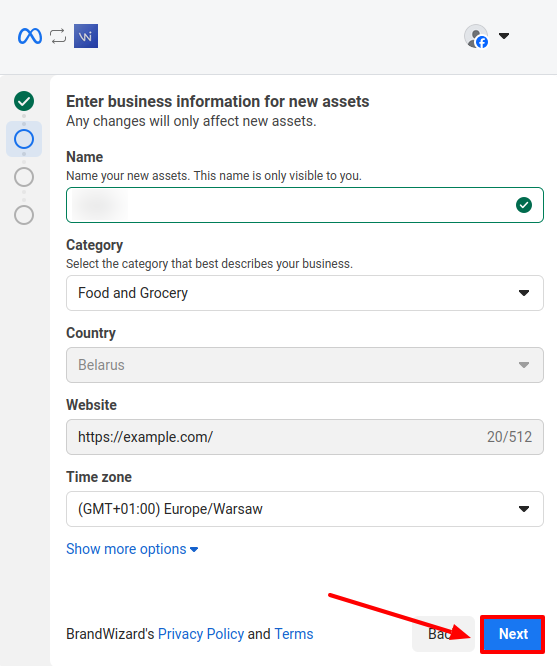 If you chose to create a WhatsApp Business account and/or a Facebook business portfolio at the previous step, the page shown below will appear. Fill in the necessary information about your company and click Next.