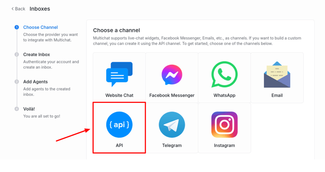 To create and configure an inbound API channel, go to Settings → Inboxes → Add Inbox.
