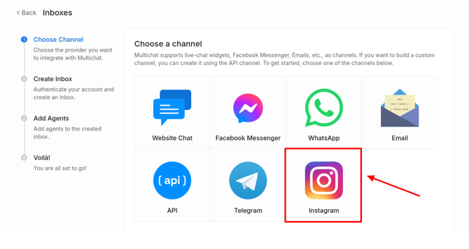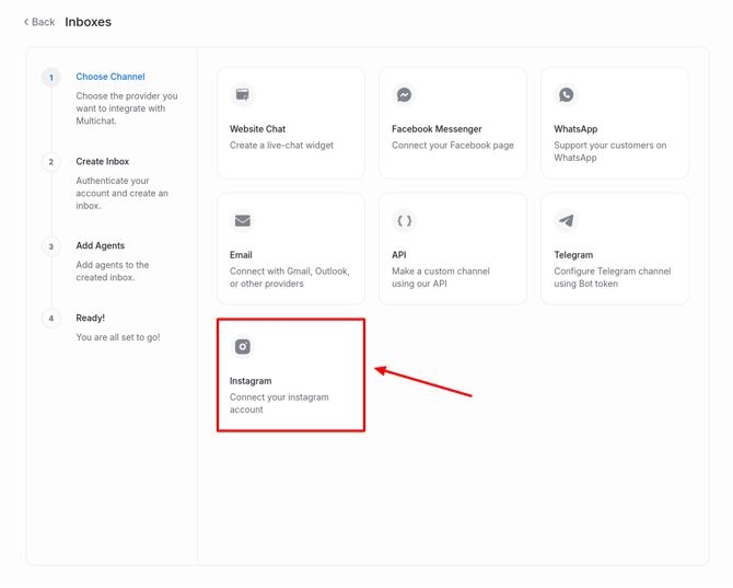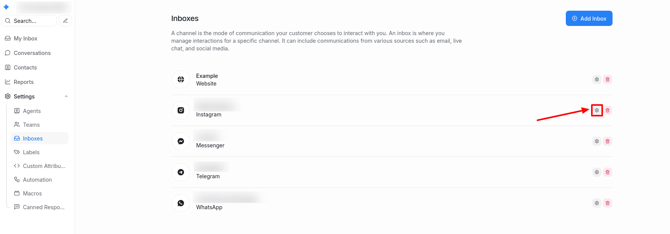 The created Instagram channel should appear in the list under the Inboxes section. To view or change additional settings, go to Settings → Inboxes, then click the gear icon on the Instagram channel.