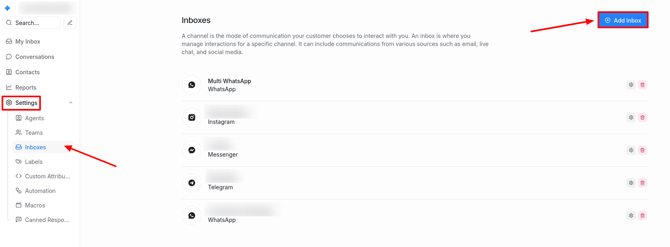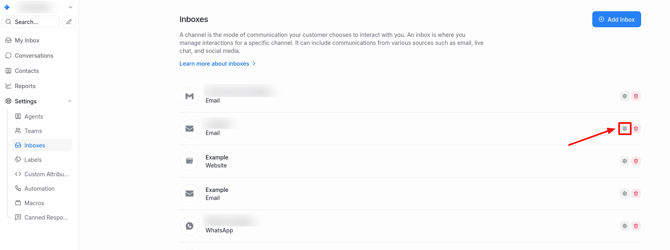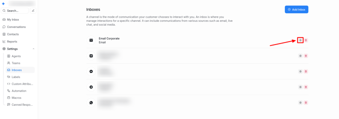The created mail channel should appear in the list in the Inboxes section. To view or modify additional settings, go to Settings → Inboxes, then click the gear icon on the email channel.