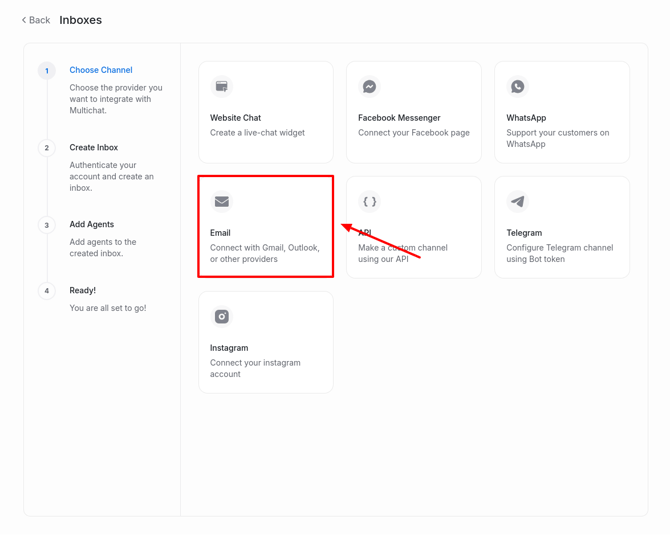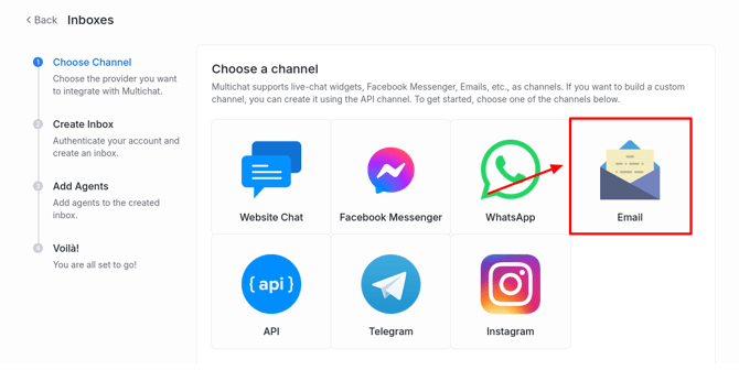 Enter the channel name (how you want to name this channel), your support email address, and click the Create Email Channel button.