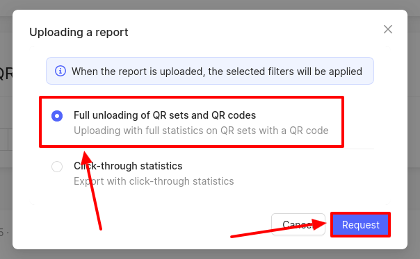 A window will open where you should select Full unloading of QR sets and QR codes, then click Request.