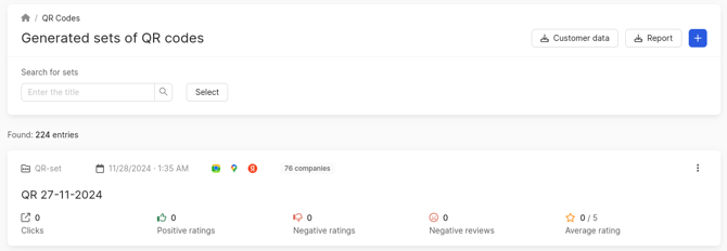 View statistics on the use of QR codes: the number of clicks, positive ratings, negative reviews and the average rating for all companies in the set.
