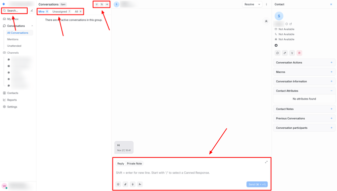 - Conversation filtering. Select different filters to see only the needed conversations. More about filters can be found here.