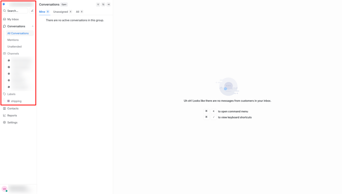 - Conversation list. This section displays conversations in chronological order (most recent or newly received at the top). You can switch between the tabs Mine, Unassigned, and All to see conversations assigned to you, not assigned to any agent, or all conversations respectively. Each conversation card shows the message channel, assigned agent, the last sent message, creation time, last message time, and labels.