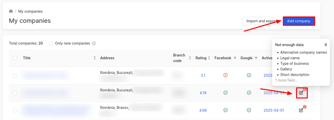 The number in the circle above the Edit icon indicates that the company's information is incomplete. When you hover the mouse cursor over it, a window will appear showing which data is missing.