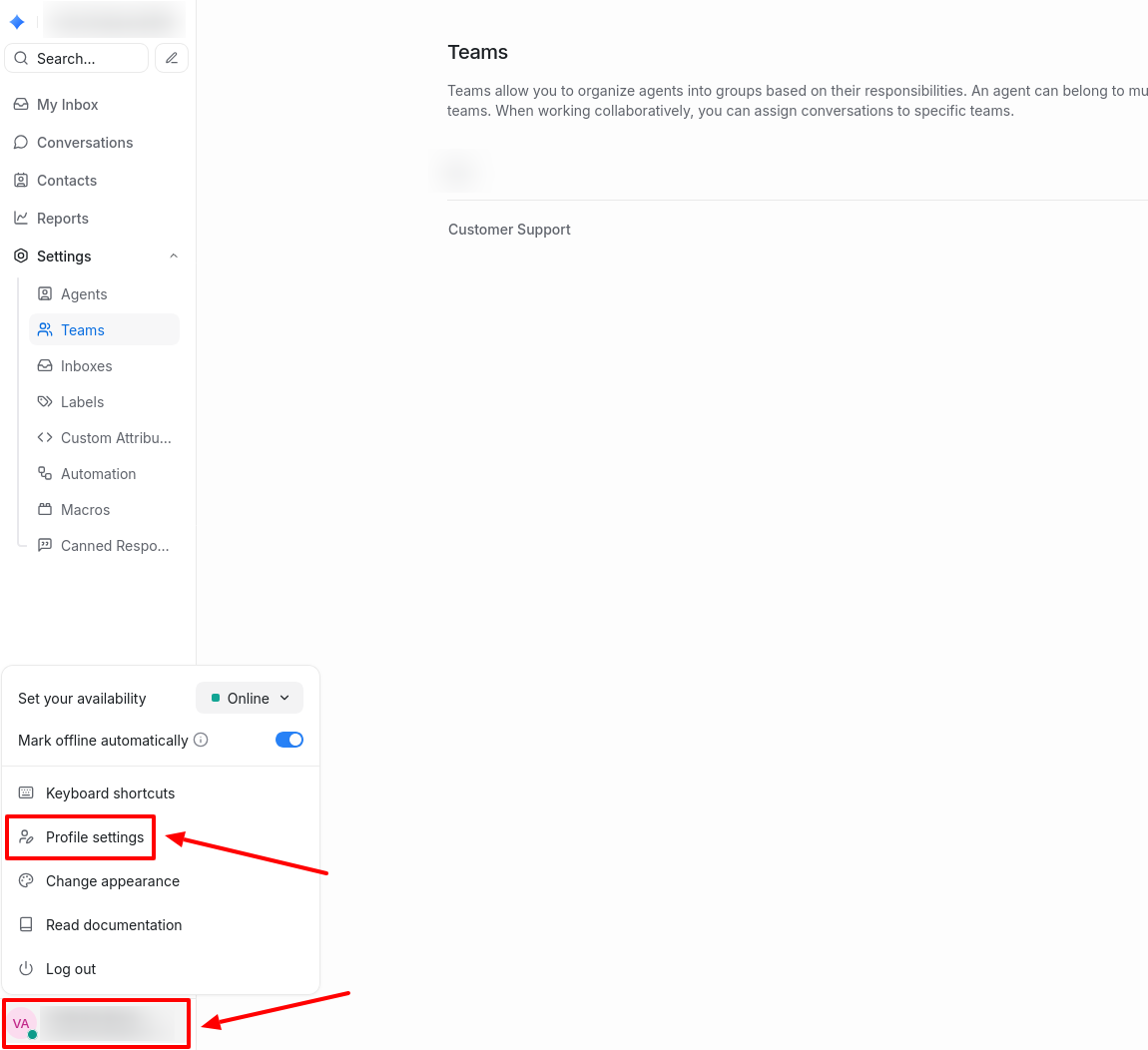 To access notification settings, click on your profile in the lower-left corner of the sidebar and select Profile Settings. Here you will find all settings for audio notifications, email, and push notifications.