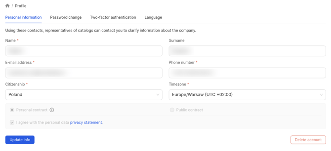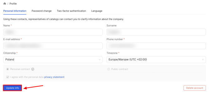In the Personal Information section, the following details are displayed: name, surname, email, phone number, citizenship, and time zone. You can update this information if necessary. Additionally, you can give your consent to receive promotional and informational newsletters from BrandWizard.