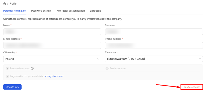 To delete your account, use the corresponding button located in the bottom right corner of the page.