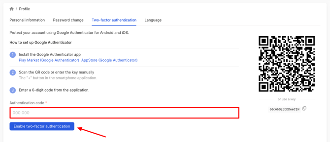 - Enter a 6-digit code from the application in the Authentication Code field and click on Enable two-factor authentication.