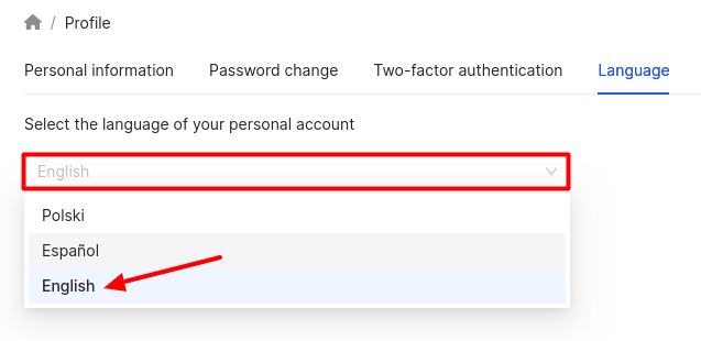 To change the language in your personal account, you should click on the field and select the desired language from the drop-down list.