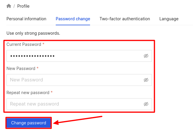 To change your password, enter your current password, then specify a new password and confirm it by repeating it in the Repeat new password field. After filling out all the fields, click the Change Password button.