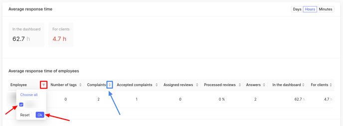 The table can be sorted by employee. To do this, click on the filter icon, select the desired employee, and click OK. The columns in the table can be filtered in ascending/descending order.