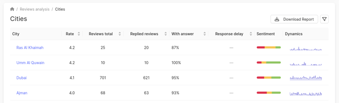 City names. When clicking on a city, the Reviews section, filtered by the selected city in the top filter, will open. You can find more information about it here.