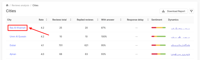 To go to the Cities page, click on Reviews Analysis in the menu box , then choose Cities from the drop-down list.