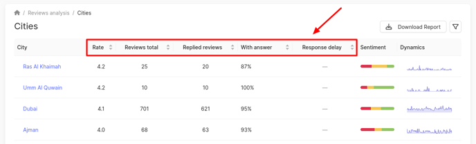 - To sort in ascending order, click on the field: Rating/Reviews total/Replied reviews/With answer/Response delay.