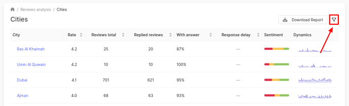 To compare review statistics by cities with a competitor, click on the filter icon.